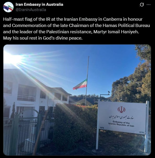 Visual displays of support for terrorist organizations were also documented through the embassy's social media channels. Following the eliminations of former Hezbollah leader Hassan Nasrallah and former Hamas leader Ismail Haniyeh, the Iranian embassy published photographs showing their facility's flags lowered to half-mast in mourning. Both Hezbollah and Hamas are formally designated as terrorist organizations by the Australian government. Additionally, both Sadeghi and the embassy posted long commemorative posts for Nasrallah.