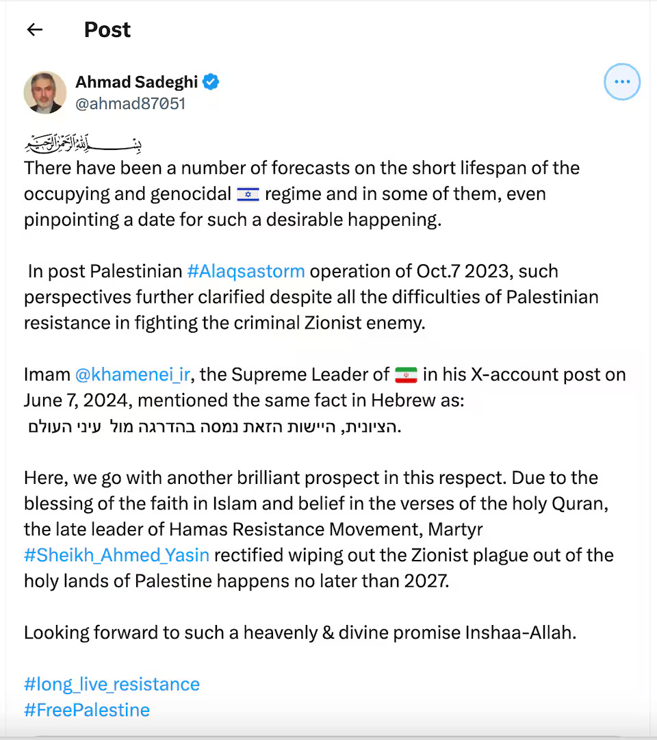 A particularly concerning post saw Sadeghi praise Hamas's "#alaqsastorm" attack and honor Hamas founder Sheikh Ahmed Yasin, who had declared that "wiping out the Zionist plague from the holy lands of Palestine" would happen no later than 2027.