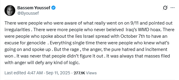 Youssef’s positions on Middle Eastern conflicts have drawn significant criticism from various observers. In a September 2025 post, he promoted conspiracy theories linking the September 11 attacks to Israeli actions, writing that “there were people who spoke about the lies Israel spread with October 7th to have an excuse for genocide” and claiming that “people didn’t believe Iraq’s WMD hoax,” suggesting parallels between historical events. Critics, including analyst Kyle Orton, have characterized Youssef’s post as promoting “conspiracy theories about the 7 October pogrom to 9/11 denialism.”