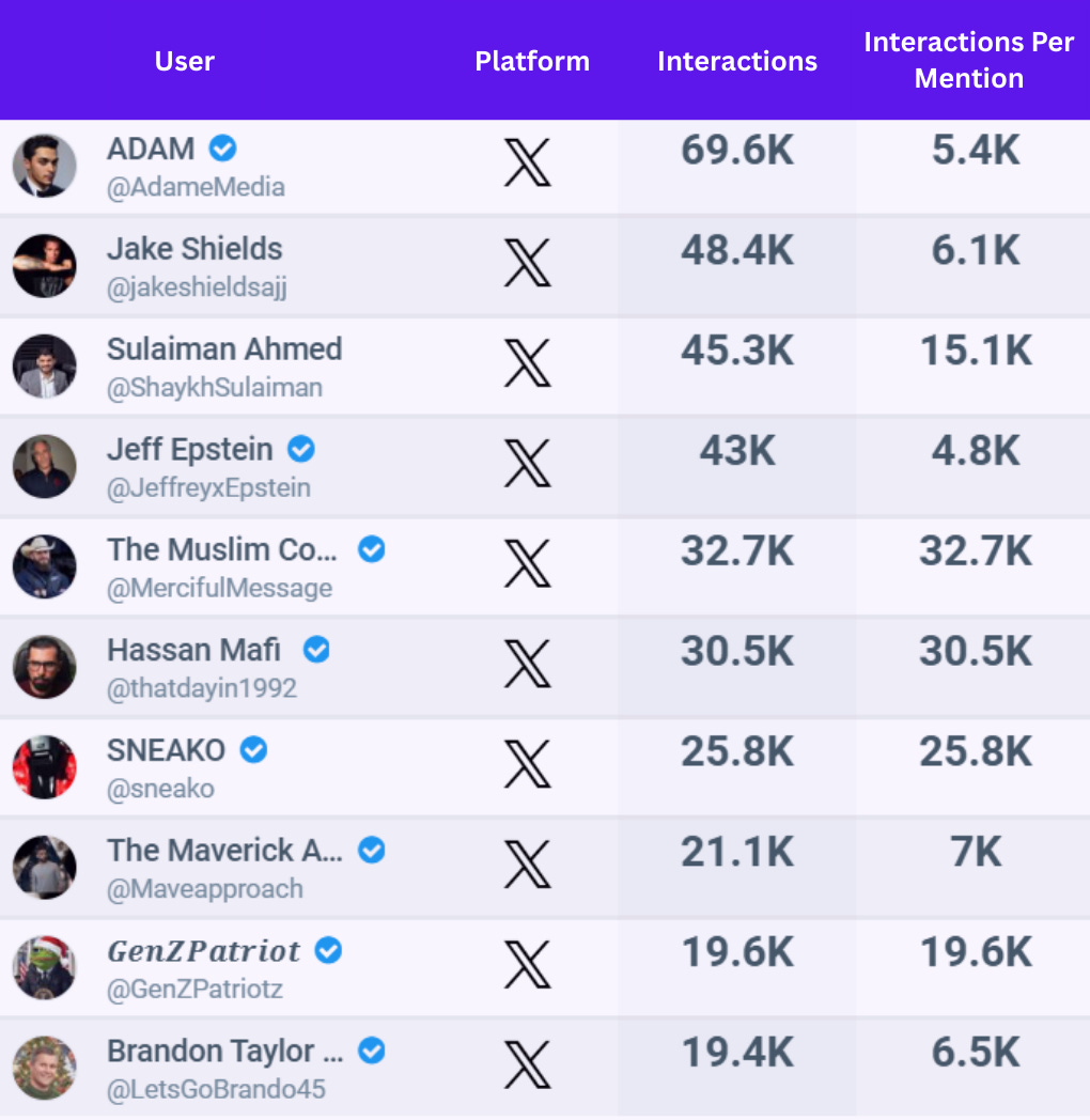 Key foreign-based accounts include UK-based AdameMedia—previously identified by the Network Contagion Research Institute as a foreign-linked disinformation agent whose posting volume surged 150% after October 7, 2023—along with Iran-based Hassan Mafi, Canada-based Brandon Taylor Moore, Norway-based antisemitic account Jeff Epstein (JeffreyxEpstein), and Saudi Arabia-based Muslim Cowboy.