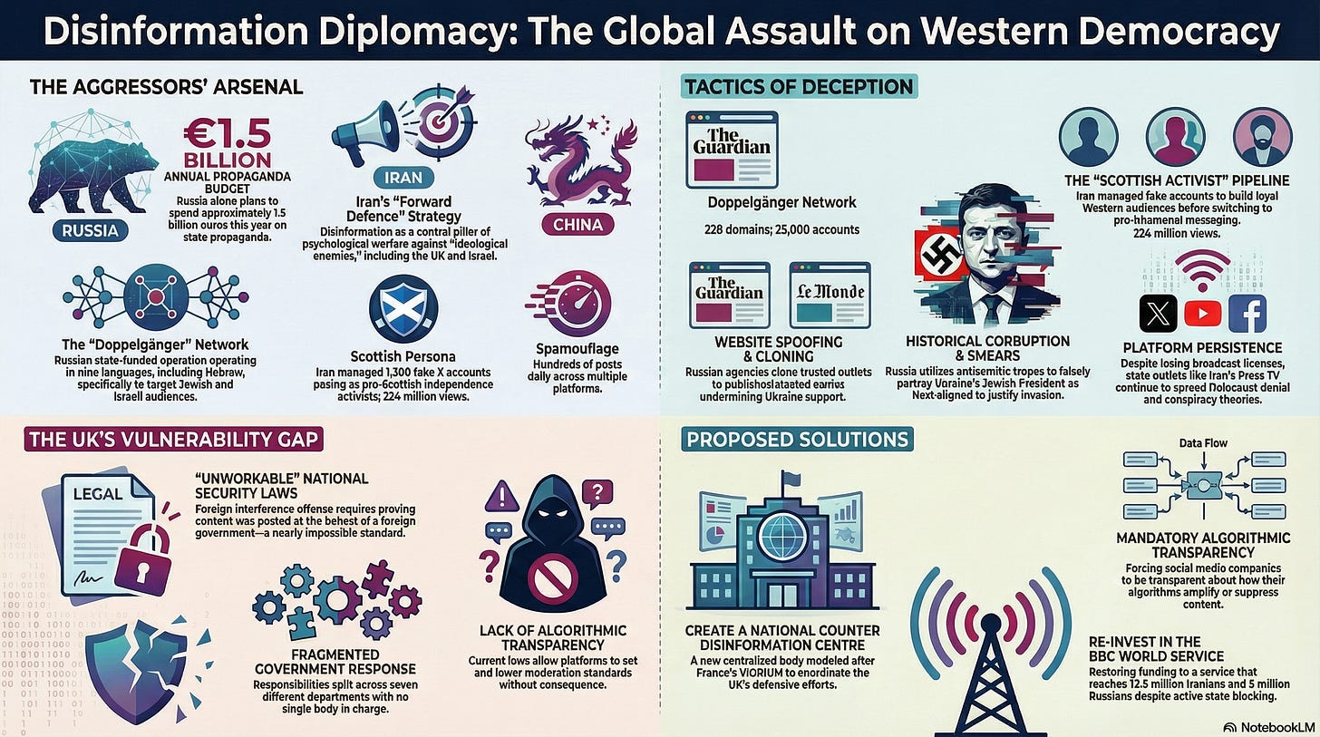 A major new report from the UK House of Commons Foreign Affairs Committee has concluded that Russia, Iran, and China are running sophisticated, government-funded disinformation campaigns targeting Jewish communities, Israeli audiences, and democratic institutions across the Western world — and that Britain is dangerously underprepared to fight back.