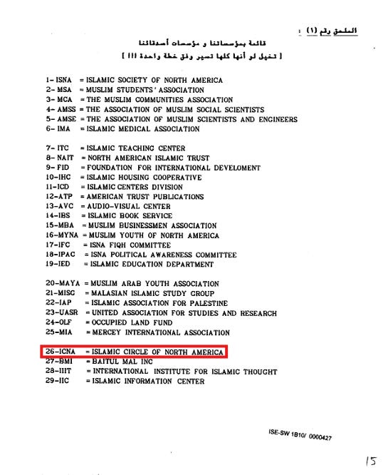 ICNA, established in 1968, was explicitly named in the 1991 Explanatory Memorandum on the Muslim Brotherhood’s strategic goals in North America—a document entered into evidence during the Holy Land Foundation terrorism financing trial. The memorandum identified ICNA as part of the Brotherhood’s network of organizations working to establish Islamic governance in the United States.
