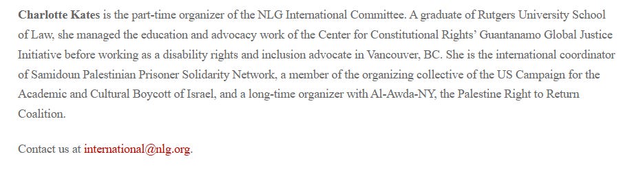 The NLG’s International Committee lists Charlotte Kates as its “part-time organizer.” Kates simultaneously serves as international coordinator of Samidoun Palestinian Prisoner Solidarity Network, which the U.S. Treasury designated as a terrorist organization in October 2024, describing it as “a sham charity that serves as an international fundraiser for the Popular Front for the Liberation of Palestine (PFLP).” Canada, Israel, and the Netherlands have issued similar designations.