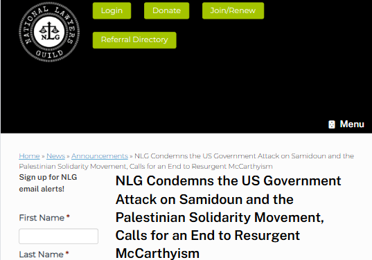 When the U.S. designated Samidoun as a terrorist entity, the NLG issued a statement condemning the action as “the latest iteration of McCarthyism” and defending Samidoun as having “no ties to any so-called designated terrorists.” The organization compared the designation to Cold War-era persecution and declared: “An attack on one is an attack on all!”