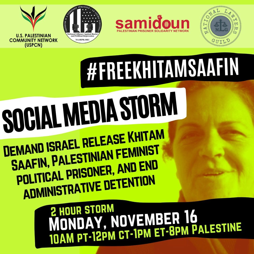 In 2020, Samidoun, the National Lawyers Guild, and the U.S. Palestinian Community Network collaborated on a campaign demanding the release of Khitam Saafin, who was arrested by Israel in 2017 for being a leader of the Popular Front for the Liberation of Palestine (PFLP). USPCN was co-founded by Rasmea Odeh, a former PFLP member who was convicted in 1970 for her role in a bombing that killed two Israeli college students.