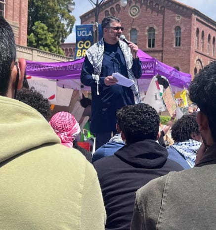 CAIR-CA provided institutional support for pro-Palestine campus encampments following the October 7, 2023 Hamas attacks on Israel, the report documents. CEO Hussam Ayloush participated as a featured speaker at UC Riverside and UCLA encampments in his official capacity. CAIR-CA established an education fund offering loans and grants to students who faced consequences for protest activities, raising over $64,000 and awarding $20,000 to 20 students.