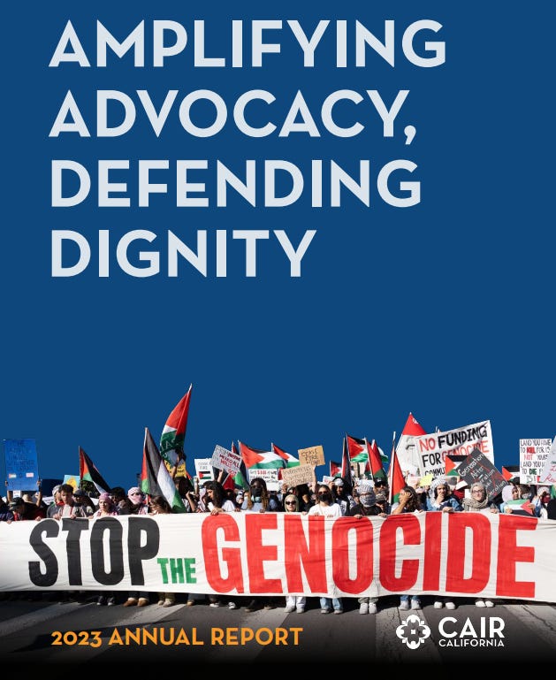 Beginning in late 2023, CAIR-CA’s advocacy became increasingly dominated by anti-Israel political mobilization. The organization’s 2023 annual report prominently featured a “STOP THE GENOCIDE” banner, marking a shift from previous years. Recent lobbying efforts in 2025 include campaigns to influence California legislation on redistricting and school discrimination protections—all conducted while receiving federal funds.