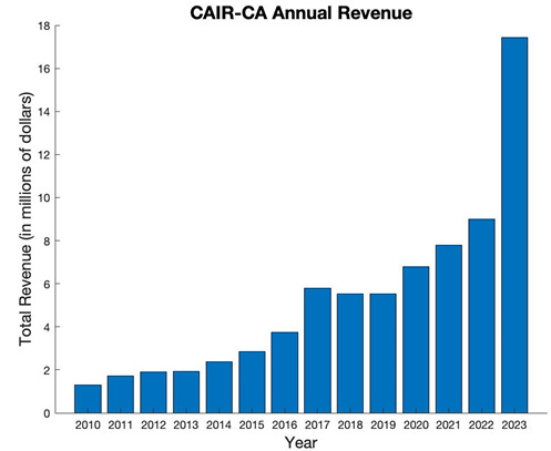 Between 2013 and 2023, CAIR-CA spent over $3.8 million on lobbying expenses while reporting only $672,537 to the IRS—leaving $3.13 million undisclosed, according to the report. The largest spike in undisclosed lobbying coincided with increased federal funding in 2023. Federal law prohibits using federal funds for lobbying activities.