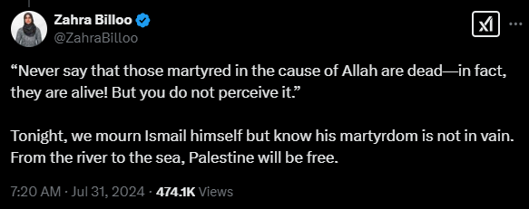 Furthermore, she has honored former Hamas leader Ismail Haniyeh, stating, “Tonight, we mourn Ismail himself but know his martyrdom is not in vain. From the river to the sea, Palestine will be free.” This phrase, commonly chanted by anti-Israel extremists, calls for the destruction of Israel and the eradication of its Jewish population.