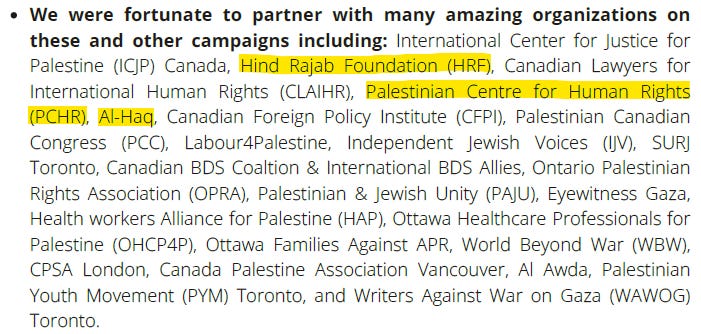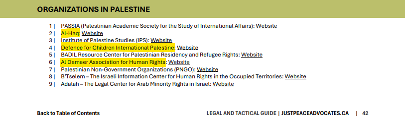 In May 2025, Just Peace Advocates released a comprehensive “Legal and Tactical Guide” designed to support pro-Palestine activists and campaigners across Canada. The guide includes an extensive “More Resources” section containing a detailed list of Palestinian and international organizations recommended to activists. Notably, this resource list explicitly includes multiple organizations designated by Israel and sanctioned by the U.S. government.