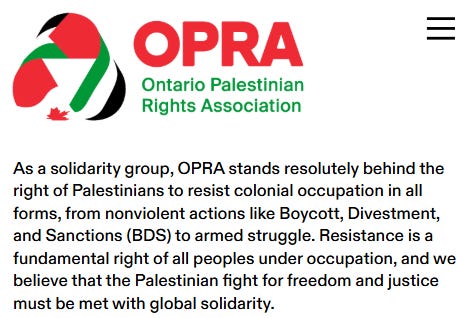 OPRA, one of the five organizations leading the campaign against Canadian summer camps, explicitly endorses "armed struggle" against Israel on its website. The phrase "armed struggle" is commonly recognized by watchdog groups as a euphemism for terrorism. This formulation provides organizational cover for endorsing attacks, bombings, and other violence while maintaining plausible deniability through vague language.