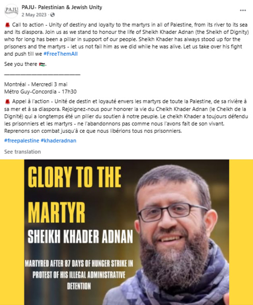 PAJU, also involved in the campaign against Canadian summer camps, has organized past events in explicit solidarity with designated terror operatives and convicted killers. The organization hosted a protest in support of Khader Adnan, a senior Palestinian Islamic Jihad leader who died in Israeli custody in May 2023 after a hunger strike. Since 2004, Adnan had been arrested 13 times by Israeli authorities due to his affiliation with Islamic Jihad's leadership.