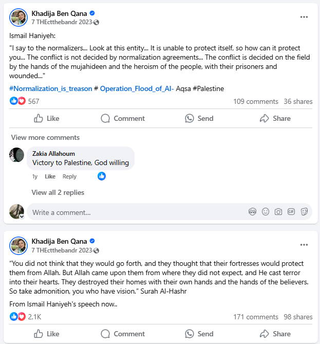 Another panelist, Khadija Bengana, is a founding member of Al Jazeera Satellite Channel and a well-known media figure in the Arab world. On October 7th, she quoted former Hamas leader Ismail Haniyeh in two posts that praised Hamas’s attacks and violence: “The conflict is decided on the field by the hands of the mujahideen and the heroism of the people.”