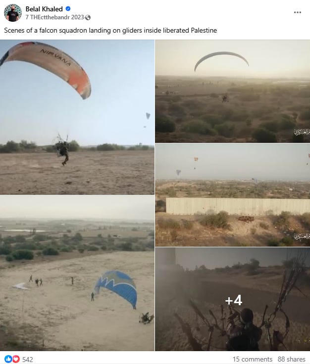One of the featured speakers, Belal Khaled, reshared images on October 7th of Hamas terrorists paragliding into Israel to carry out attacks, captioning it, “Scenes of a falcon squadron landing on gliders inside liberated Palestine.” In another post from the same day, he shared a photo of Hamas rockets being fired at Israel, writing, “Gaza writes history.” Khaled also posted a graphic appearing to depict armed terrorists marching toward the Al-Aqsa Mosque with the chilling caption, “We will see you soon.”