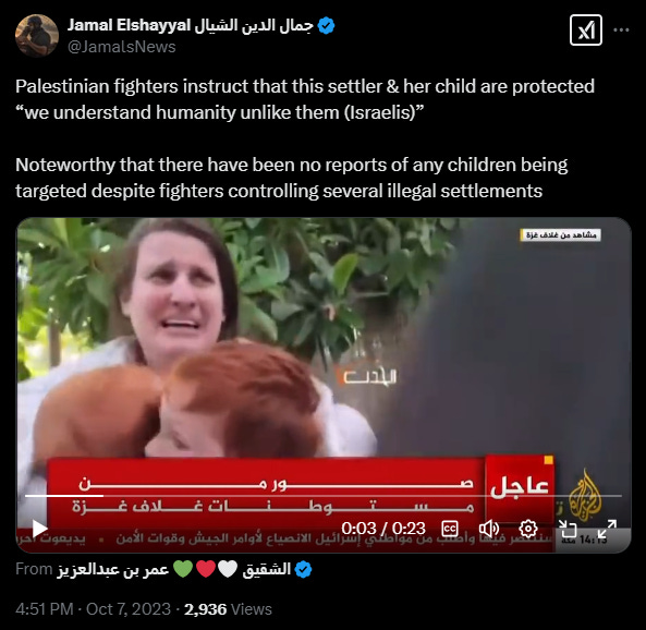 Jamal Elshayyal, another featured speaker, reshared a Hamas propaganda video from October 7th depicting the kidnapping of the Bibas family. He promoted Hamas’s disinformation campaign by falsely asserting that “there have been no reports of any children being targeted despite fighters controlling several illegal settlements.” This directly contradicts verified reports of Hamas’s atrocities against civilians, including children, on that day.