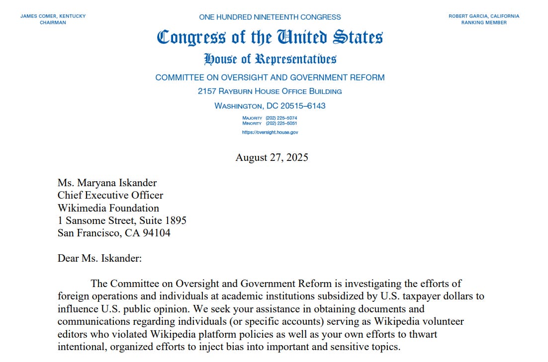 The U.S. House Oversight Committee letter to Wikimedia CEO Maryana Iskander underscores growing scrutiny of the Foundation’s leadership, tax-exempt status, and role in shaping public knowledge