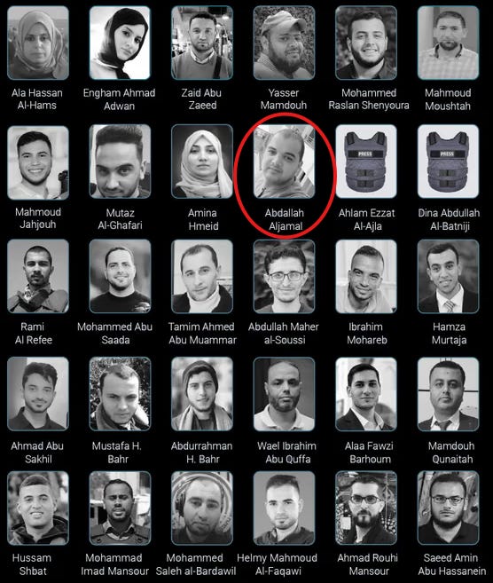 However, many of the journalists on the list have previously been exposed as moonlighting for terror organizations such as Hamas. One example is Abdallah Aljamal, who does not appear on the list but was left in the accompanying photo. Aljamal was previously revealed to be a Hamas operative who held Israeli hostages in his home while also writing for the US-based outlet Palestine Chronicle.