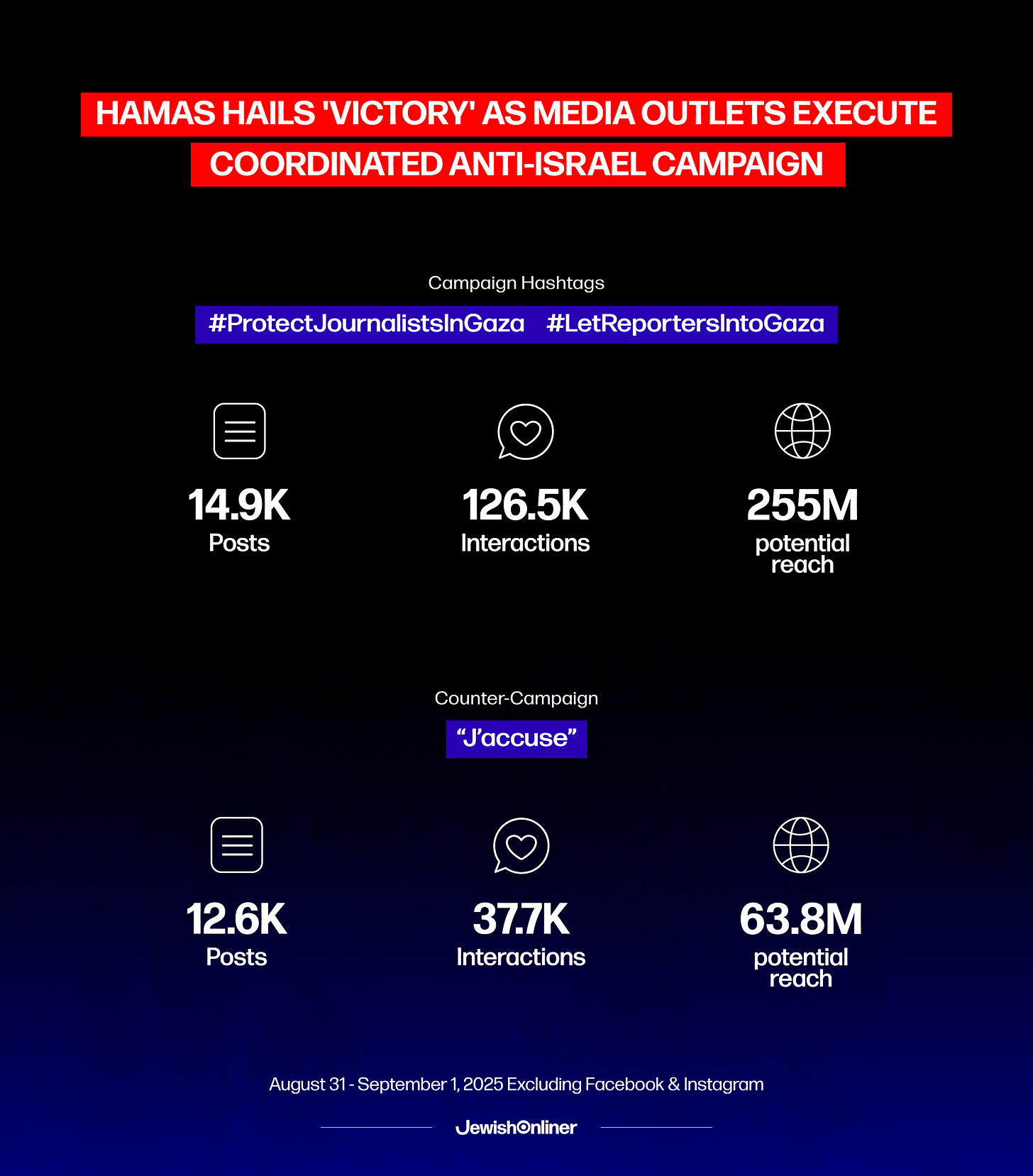 A social media analysis by Jewish Onliner found that results for #ProtectJournalistsInGaza and #LetReportersIntoGaza on X for the dates August 31 September 1 generated 14.9k posts, 126.5k engagements, and 255 million potential views, demonstrating the significant reach of the coordinated messaging effort.