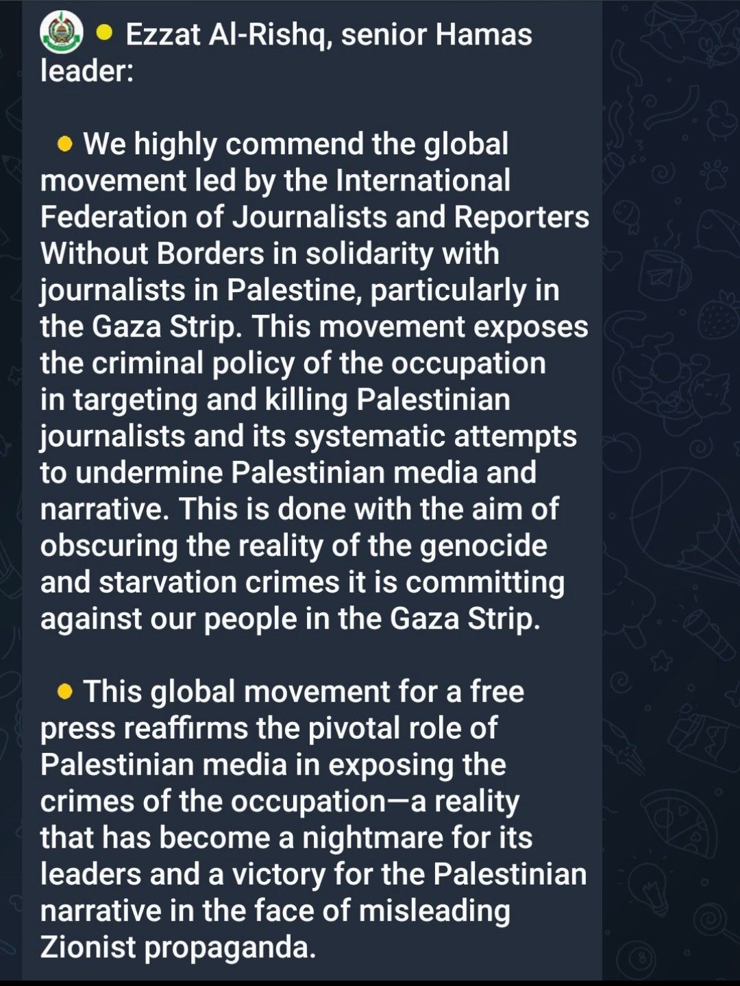 i24 News Senior Middle East Correspondent Ariel Oseran reported that senior Hamas official Izzat Al-Risheq publicly thanked the participating media outlets, calling the coordinated campaign "a victory for the Palestinian narrative" - confirming fears about who ultimately benefits from such orchestrated efforts.