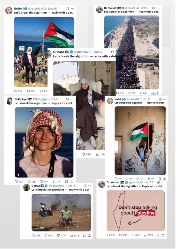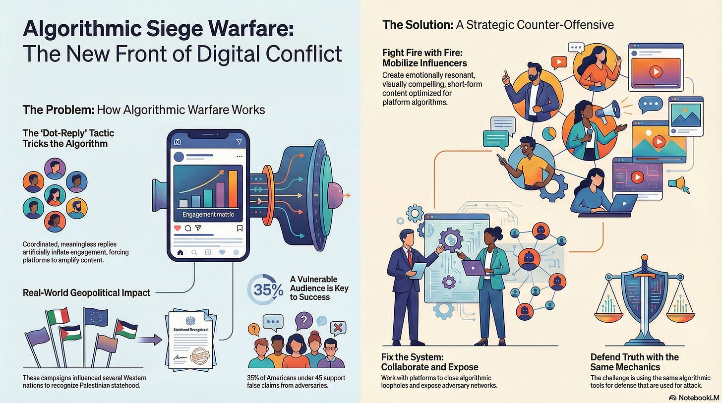 The Jerusalem Institute for Strategy and Security (JISS) has identified “Algorithmic Siege Warfare”—a tactical evolution centered on a deceptively simple technique. Coordinated networks instruct supporters to “break the algorithm – reply with a dot.” These semantically meaningless replies artificially inflate engagement metrics, triggering platform algorithms to amplify content to wider audiences.
