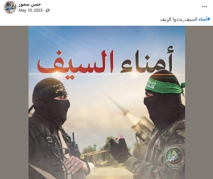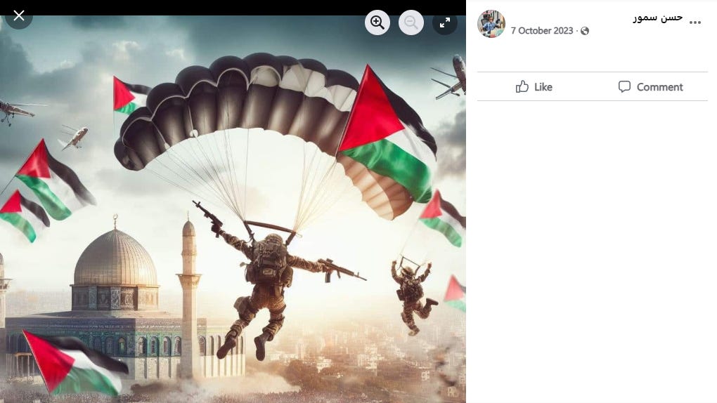 On October 7, 2023, Samour shared several images—likely AI-generated—depicting armed terrorists paragliding onto the Al-Aqsa Mosque.