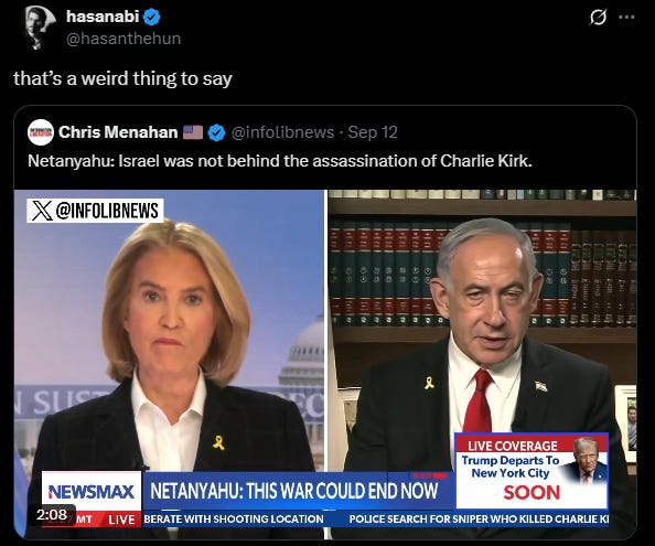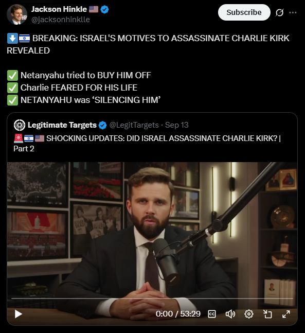 Piker reposted a video of Israeli Prime Minister Benjamin Netanyahu being interviewed on NewsMax. When Netanyahu was asked about online conspiracies suggesting Israel was behind Kirk's killing, the Prime Minister called such theories "insane" and compared them to historical blood libels against Jews.