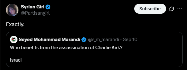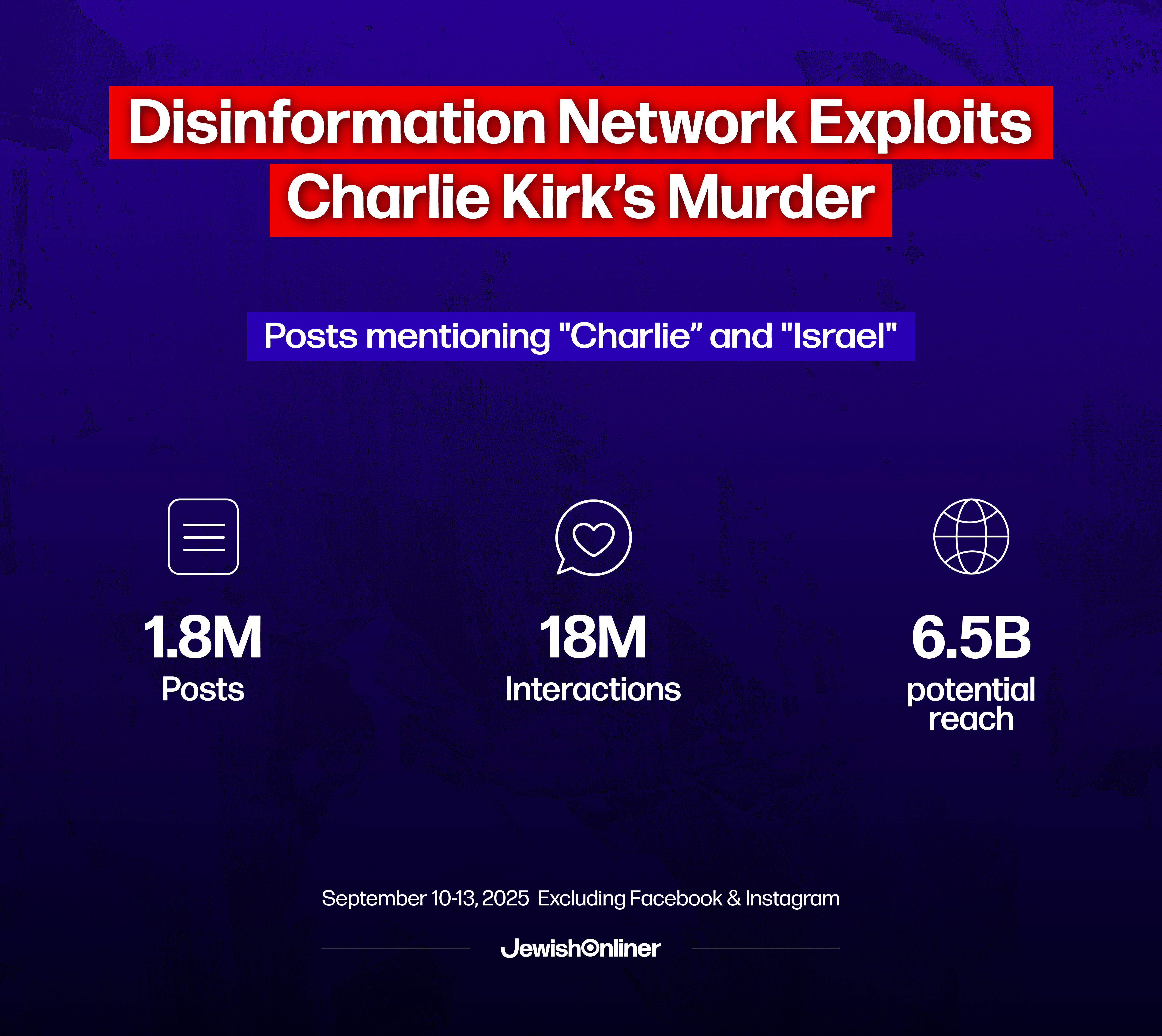A comprehensive social media analysis conducted by a Jewish Onliner found that posts containing both "Charlie" and "Israel" generated 1.8 million posts, 18 million engagements, and reached 6.5 billion potential views between September 10-13, indicating widespread weaponization of Kirk's death within just three days. Among the top influencers pushing these claims have been ones in the pro-Kremlin, pro-Assad, and pro-Hamas social media orbit.