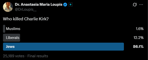 Dr. Anastasia Maria Loupis, a physician from Copenhagen, Denmark, who regularly promotes antisemitic narratives, has also played a significant role in amplifying the false narrative surrounding Kirk's murder.
