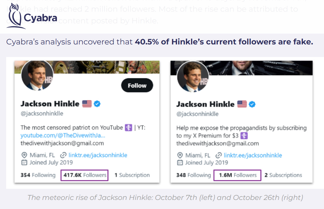 The analysis found that an average of 25% of users interacting with popular anti-Israel influencers on platform X are fake accounts, with a quarter of these fraudulent profiles created after October 7, 2023. Specific analysis of Hinkle's account found that 40% of the users that engaged with his content were fake.
