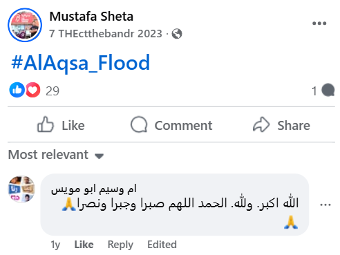 On Sheta’s own Facebook on October 7, 2023, in response to the Hamas attack on Israel, he posted “#AlAqsa_Flood” and reshared a post glorifying the Hamas attack that wrote, “For the first time in history, The dream awakens reality from sleep and defeat.” He also posted a video from 2013 of a performance at a ceremony for the 46th anniversary of the PFLP, further highlighting his alignment with the group.