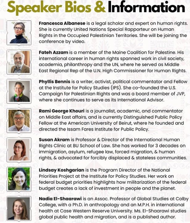 Fateh Azzam, listed as a speaker representing the Maine Coalition for Palestine, previously directed al-Haq from 1987 to 1995, according to his professional profile. On October 2021, Israel’s Ministry of Defense designated al-Haq as a “terror organization” for operating on behalf of the Popular Front for the Liberation of Palestine (PFLP).