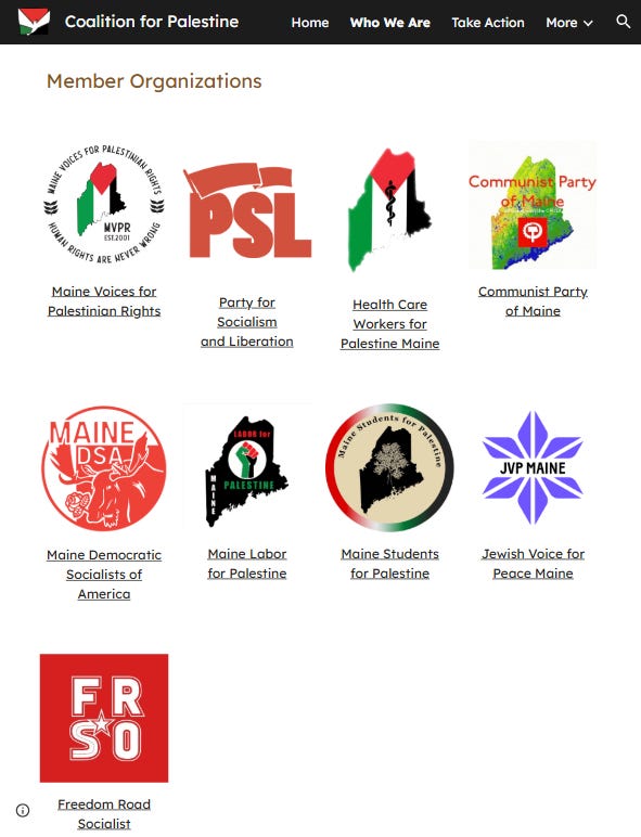 Member organizations of the Maine Coalition for Palestine include the Party for Socialism and Liberation (PSL), Maine Democratic Socialists of America, and Jewish Voice for Peace Maine (JVP).