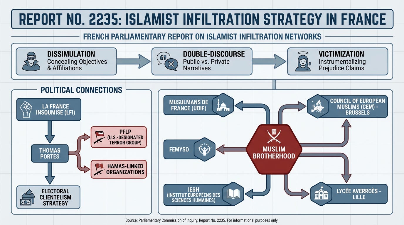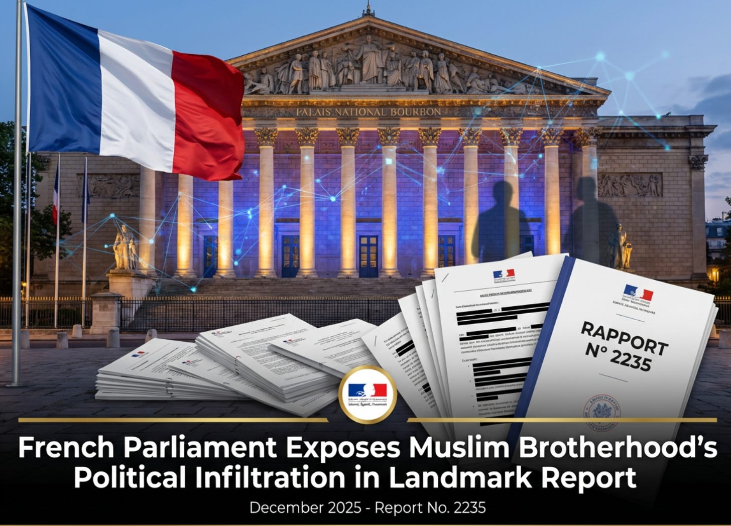 The French National Assembly registered investigative Report No. 2235 on December 10, 2025, documenting how Muslim Brotherhood ideology and affiliated networks have systematically infiltrated French political institutions, local governments, and civil society—posing what lawmakers describe as an existential threat to the country's secular order and its Jewish communities.