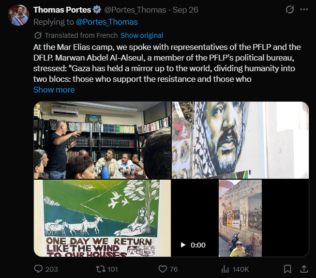 The parliamentary investigation identified specific connections between elected officials—particularly within the far-left La France Insoumise (LFI) party—and organizations tied to designated terrorist groups. Deputy Thomas Portes traveled to Lebanon where he met with Marwan Abdel-al and Haitham Abdo, two officials of the U.S.-designated terror group, the Popular Front for the Liberation of Palestine (PFLP). Portes has also met with Abu Amir Eleiwa, coordinator of Humani’Terre, an organization with documented ties to Hamas and the Muslim Brotherhood.