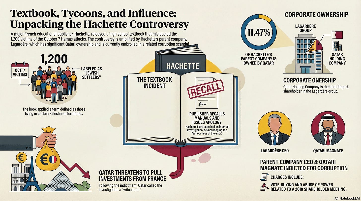 A French high school textbook is under scrutiny after describing the 1,200 victims of Hamas’s October 7, 2023 attacks as “colons juifs“ (Jewish settlers), according to LICRA, France’s International League Against Racism and Antisemitism. Adding to the controversy, the textbook is published by Hachette Education, a major French publisher of school textbooks and pedagogical resources for teachers and students. Hachette’s parent company is currently embroiled in a corruption scandal involving Qatari influence.