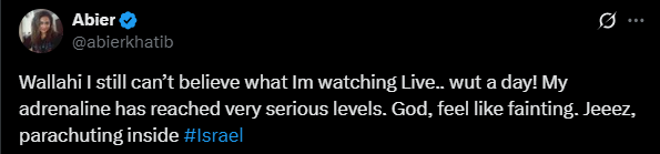 Among the top influencers amplifying the "83%" narrative was Abier Khatib. Khatib made numerous posts on October 7, 2023, praising Hamas's massacre, including celebrating Israeli civilians being kidnapped by Hamas and sharing Hamas propaganda of the attack.