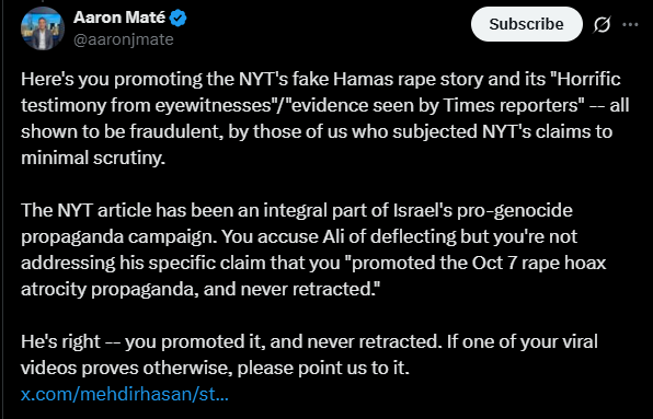 Another key amplifier was Aaron Maté, a journalist with The Grayzone who has denied evidence of Hamas sexual crimes on October 7 as “fraudulent." A 2022 study by the Institute for Strategic Dialogue found that Maté was a prolific spreader of disinformation as part of a Russia-backed network that sent thousands of disinformation tweets to distort the reality of the Syrian conflict.