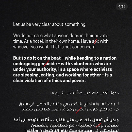 The allegations distinguish between private conduct and abuse of authority. “We do not care what anyone does in their private time. At a hotel. In their own home,” the post clarified. “But to do it on the boat - while heading to a nation undergoing genocide, with volunteers who are under your authority, in a space where activists are sleeping, eating, and working together - is a clear violation of ethics and power.”