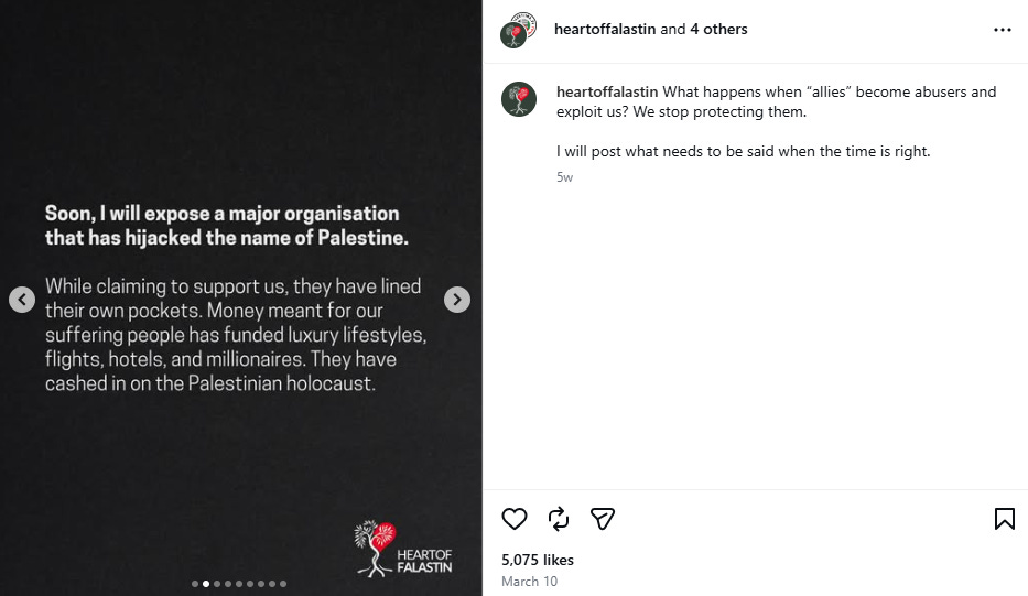 Beyond the sexual misconduct claims, Heart of Falastin accused the organization’s leadership of verbal abuse. According to the posts, a leadership member identified as “L.F.” allegedly said that the leadership “shouts at everyone. That’s okay. They don’t mean it. Take it with an open heart.”