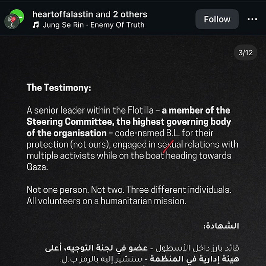 According to Heart of Falastin’s Instagram posts, a Steering Committee member identified only as “B.L.” engaged in sexual relations with multiple activists during a prior voyage to Gaza. “Not one person. Not two. Three different individuals. All volunteers on a humanitarian mission,” the post stated.