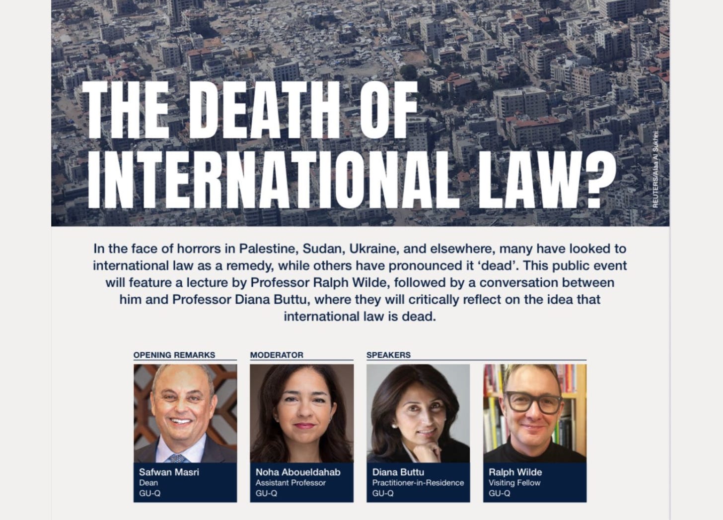 The upcoming event, titled “The Death of International Law?”, will feature Professor Ralph Wilde from University College London, Diana Buttu, a Harvard lecturer, and Georgetown Qatar’s own Assistant Professor Noha Aboueldahab as moderator.
