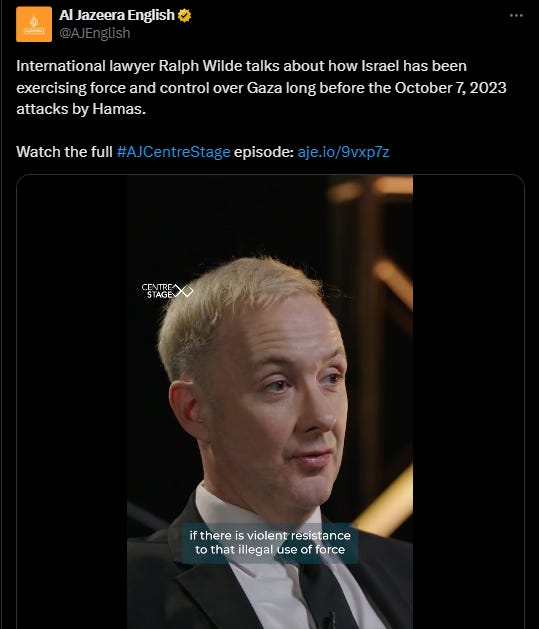 Ralph Wilde wrote a November 2023 article in Opinio Juris arguing that “Israel’s War in Gaza is Not a Valid Act of Self-defence in International Law.” He also told Al Jazeera that “violent resistance” - a euphemism for Hamas and other Palestinian terror groups - is legitimate against Israel’s “illegal use of force.”