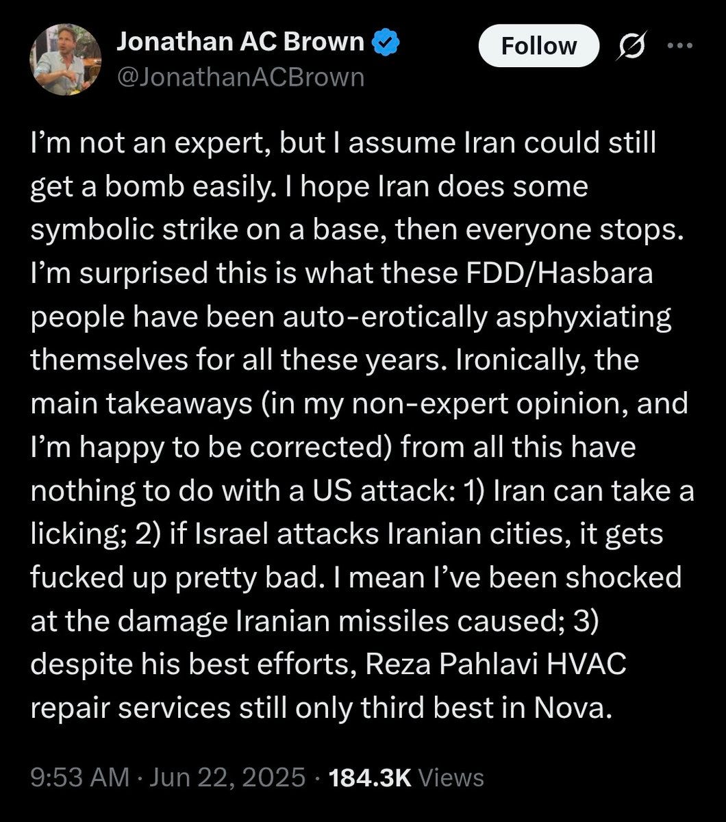The controversy erupted on June 22, 2025, when Brown posted on X during the ongoing Israel-Iran war: "I'm not an expert, but I assume Iran could still get a bomb easily. I hope Iran does some symbolic strike on a base, then everyone stops." The post came one day after the United States entered the war by launching strikes on Iranian nuclear facilities. Iran subsequently conducted a strike on a U.S. base in Qatar the following day.