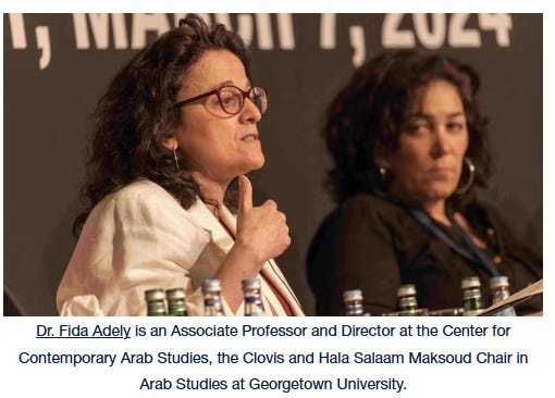 Fida Adely, moderating the April 8 event and serving as CCAS Director, is described by the Middle East Forum as “a staunch supporter of the anti-Israel Boycott, Divestment and Sanctions (BDS) movement.” Adely spoke at a 2024 Georgetown University event in Doha alongside operatives with alleged ties to Hamas and the Popular Front for the Liberation of Palestine (PFLP).