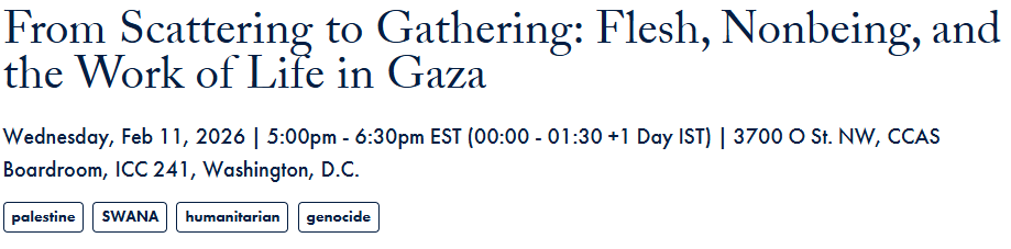 Additional events in the lecture series include a February 4 lecture by Columbia University’s Hadeel Assali titled “Opacity in Gaza: Intimate Relations as Resistance,” and a February 20 talk by Barnard College and Columbia University Professor Nadia Abu El-Haj titled “What Do They Know? A Portrait of Perpetration and Complicity in the Gaza Genocide.” All events are held in the same CCAS Boardroom and share the same institutional sponsors, with each event description tagged with keywords including “Palestine,” “SWANA,” “humanitarian,” and “genocide.”