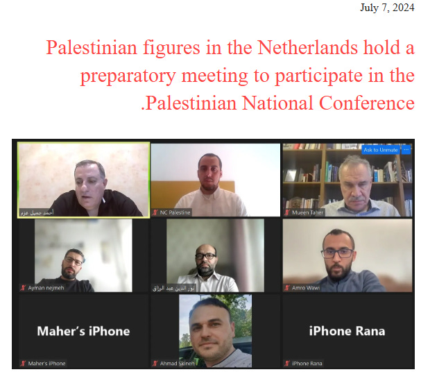 A deeper look into the conference reveals that it has further ties with Hamas-affiliated individuals that operate in Europe. In July, 2024, a Zoom meeting was held with Palestinian figures residing in the Netherlands to discuss preparations for participation in the Palestinian National Conference.
