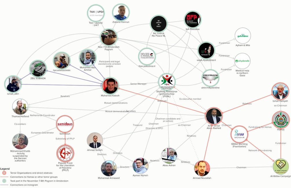 ELNET also notes that PGNL has organized numerous pro-Hamas protests in the Netherlands and hosted high-profile Hamas events, including a 2007 video conference with former Hamas leader Ismail Haniyeh and a 2016 event honoring Hamas founder Sheikh Ahmed Yassin.