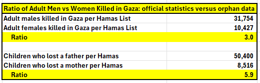 According to Aizenberg’s findings, this orphan data reveals a 6:1 male-to-female death ratio across “tens of thousands of data points,” which he argues “starkly contradicts the claimed 3x ratio claimed in the official fatality list.” He notes that while orphan data doesn’t specify how many fathers or mothers were killed (since each parent may have had multiple children), the statistical pattern across such a large dataset is revealing.