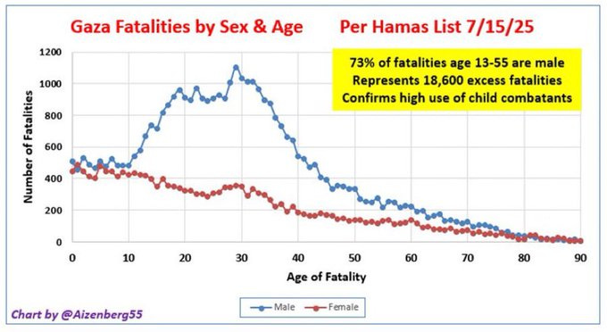 Aizenberg’s analysis suggests this gap exposes “thousands of male combatants removed from record but inadvertently revealed in this new data.” He estimates that Hamas excluded approximately 7,000 male combatants from their official casualty lists to conceal military losses, though he notes the actual number “may be even greater than that.”