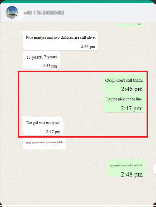 Zlochin identifies several key omissions in media reconstructions. Most notably, he points to Arabic WhatsApp messages visible in Al Jazeera’s own screenshots but never mentioned in English reporting. One message stated family members “got out and they are in a house” near the car—contradicting the “trapped inside” narrative central to the execution claim.